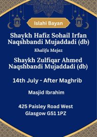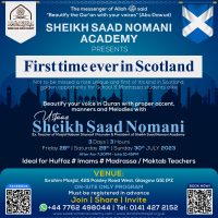 Click link/poster to book Event. For the students of Scotland's schools and madrassas, this is an exceptional opportunity to take advantage of and enhance their ability to recite the Quran in a melodic manner. Sheikh Qari Saad Nomani, the founder and president of the Sheikh Saad Nomani Academy, will come to your hometown of Scotland to lead prayers and improve the way people read the Holy Quran. Don't miss this unique opportunity and make every advantage of it. Must [...]